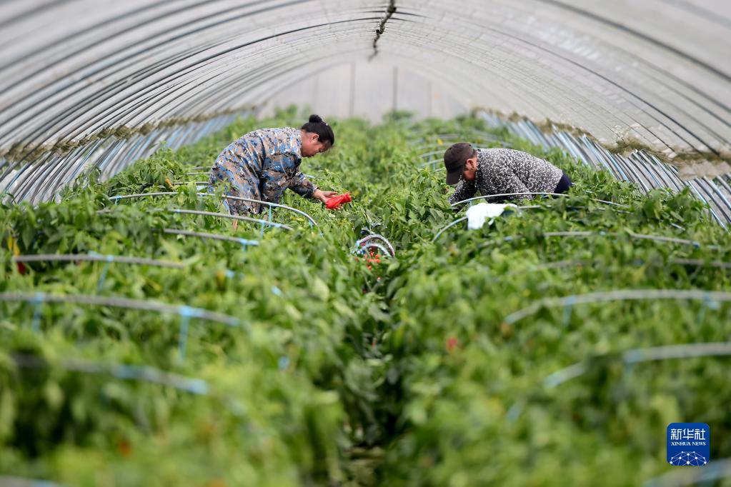 11月4日清晨,安徽省马鞍山市和县历阳镇太平村村民在蔬菜大棚里采摘辣椒。新华社记者 周牧 摄