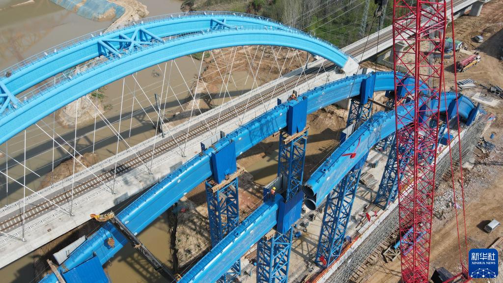 这是中铁四局引江济淮合九铁路改建工程特大桥系杆拱合龙施工现场(4月2日摄,无人机照片)。