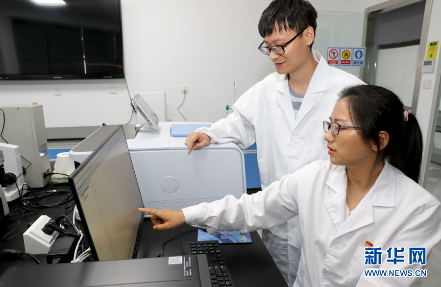 4月27日,陈娟和同事利用红外光谱仪分析分子结构。