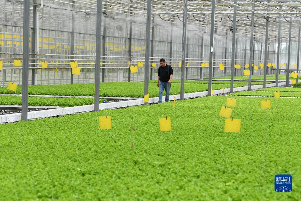 5月12日,工作人员在合肥市肥西县花岗镇现代农业示范区一蔬菜种植基地内查看蔬菜长势。