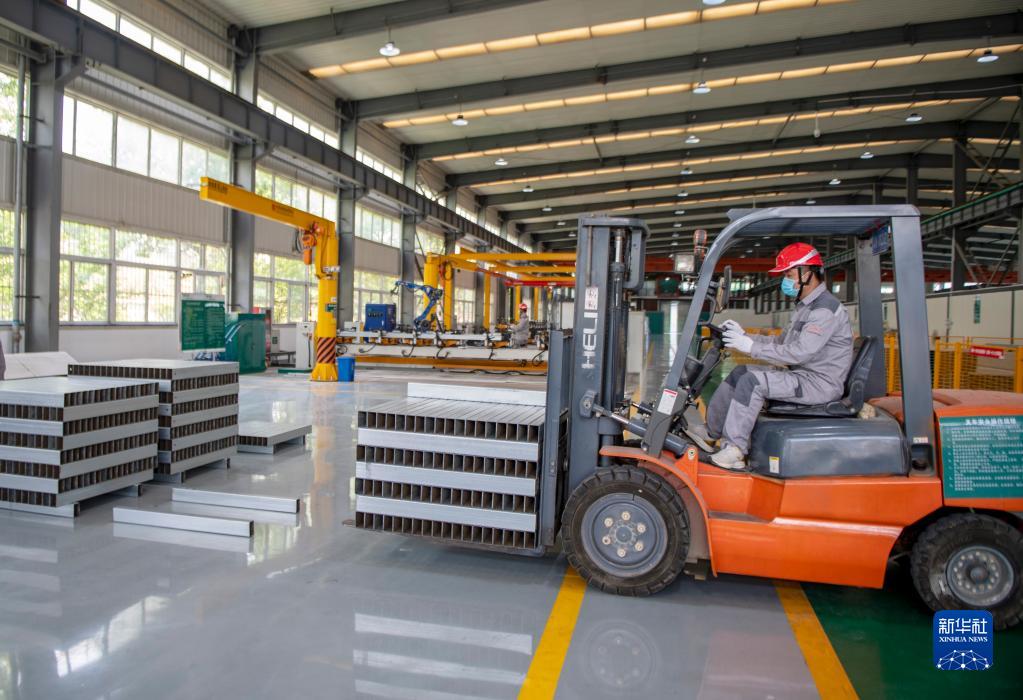 5月13日,安徽送变电工程有限公司的技术工人在模块化变电站生产线上搬运材料。