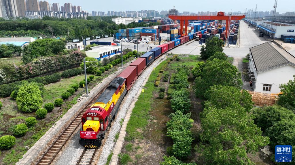 7月29日,合肥至匈牙利布达佩斯的中欧班列从合肥北站物流基地驶出(无人机照片)。