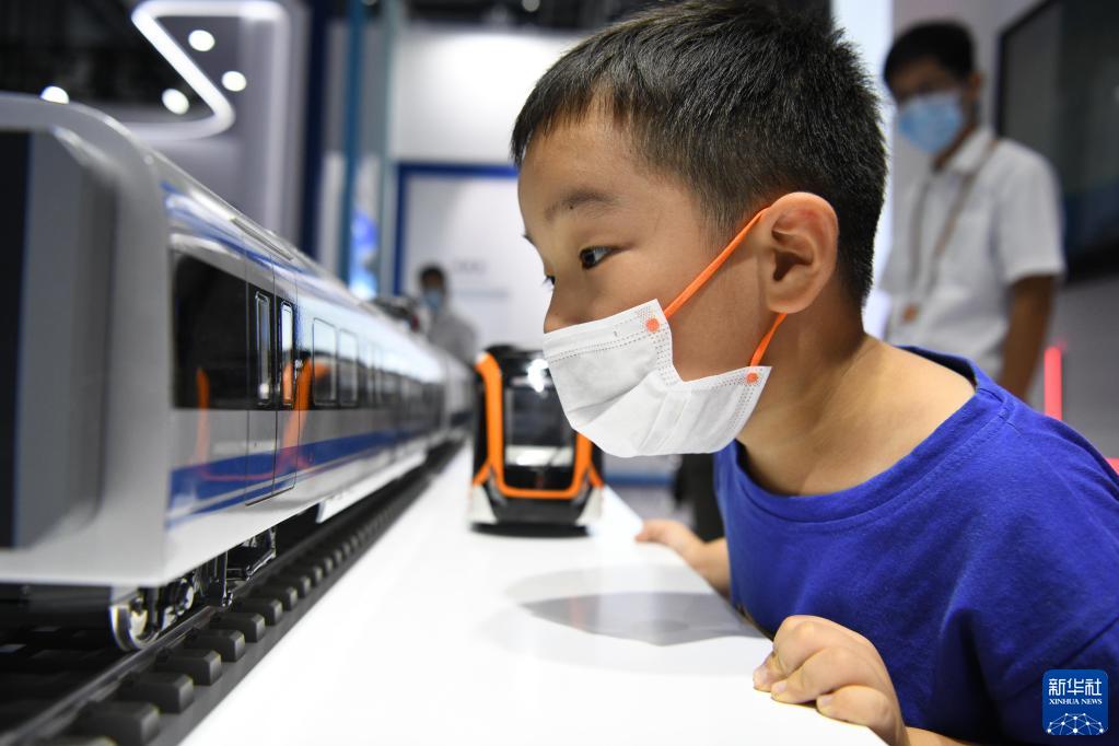 9月20日,在2022世界制造业大会上,小朋友在中国中车展台参观。