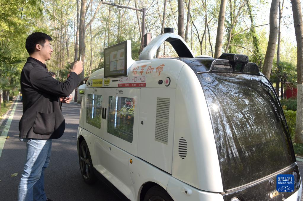 10月11日,在合肥滨湖国家森林公园,一名游客在无人售卖车前扫码购物。