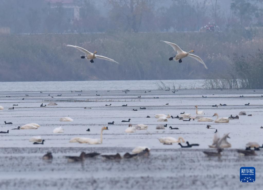 11月11日,天鹅在庐江县黄陂湖上飞翔。