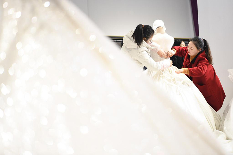 在“中国·丁集婚纱特色小镇”里,蒋厚会(右)正在整理店内的婚纱样品。新华社记者张端 摄