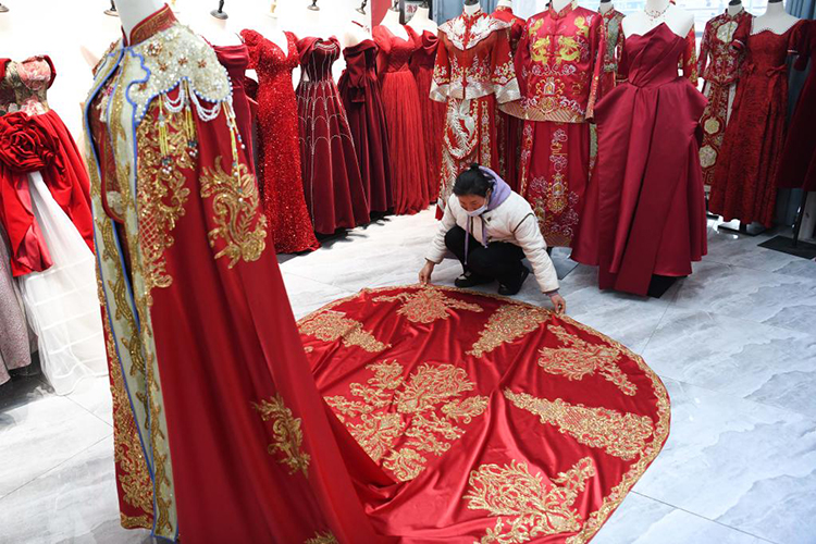 丁集镇一家婚纱店内,工作人员正在整理中式婚服。新华社记者张端 摄