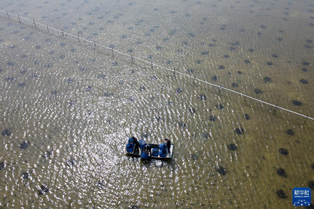 3月9日,在安徽省蚌埠市五河县小圩镇,蟹农在投放蟹苗(无人机照片)。