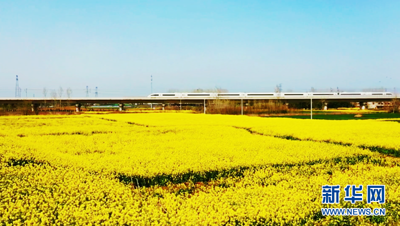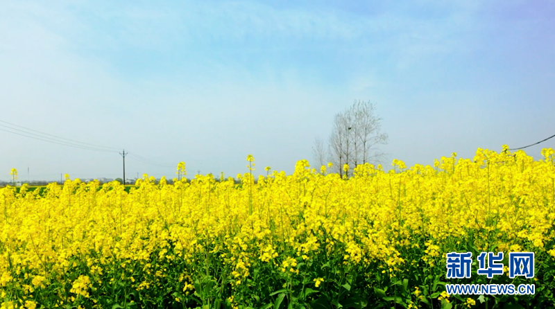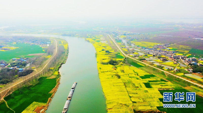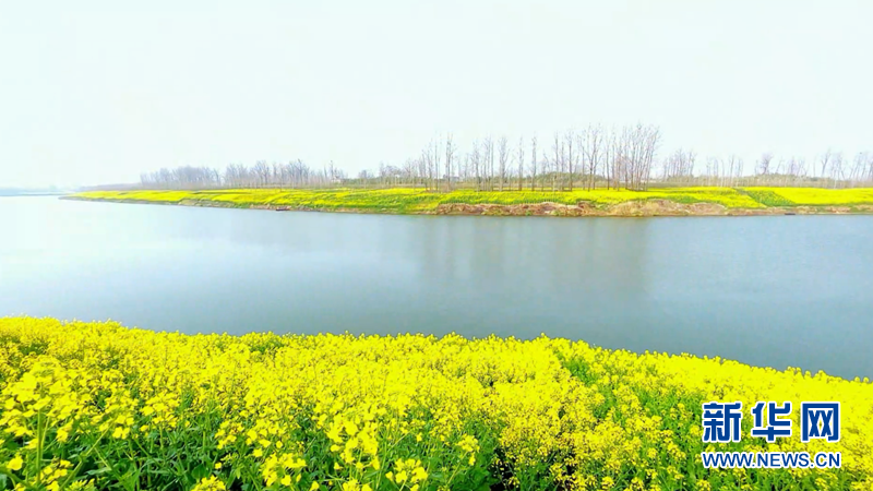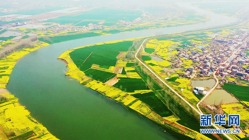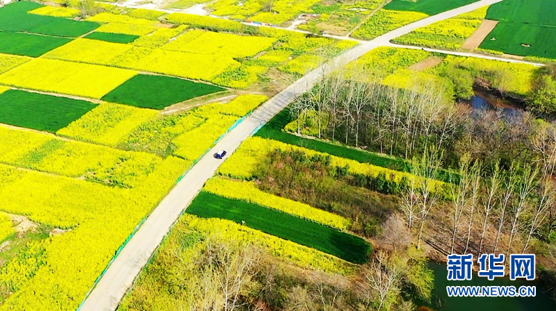 近日,安徽省阜阳市颍上县大片油菜花竞相绽放。金灿灿的油菜花铺满大地,宛若一片金色的海洋,散发出浓浓春意。花海与河流、道路、村庄交相辉映,勾勒出一幅美丽的生态田园画卷。新华网发(徐红梅 摄)