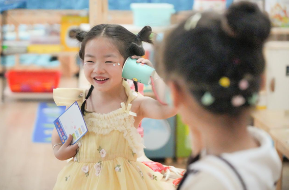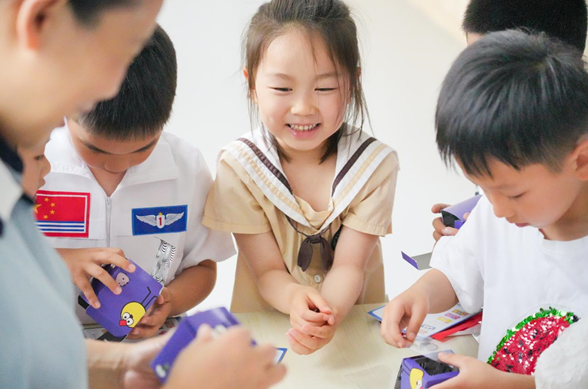 随着动感的音乐声响起,孩子们身着手工自制的各种科技感服装依次入场,和园长老师一起走进科技园游会。幼儿园老师们为孩子们准备了干冰秀、空气炮、泡泡秀等炫酷的科学实验,每个教室还有魔法小水滴、神奇超能力、声音大探索、磁铁力量大等11个主题和28个实验小游戏。(程力)