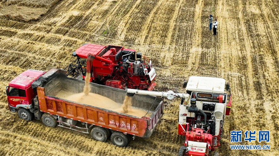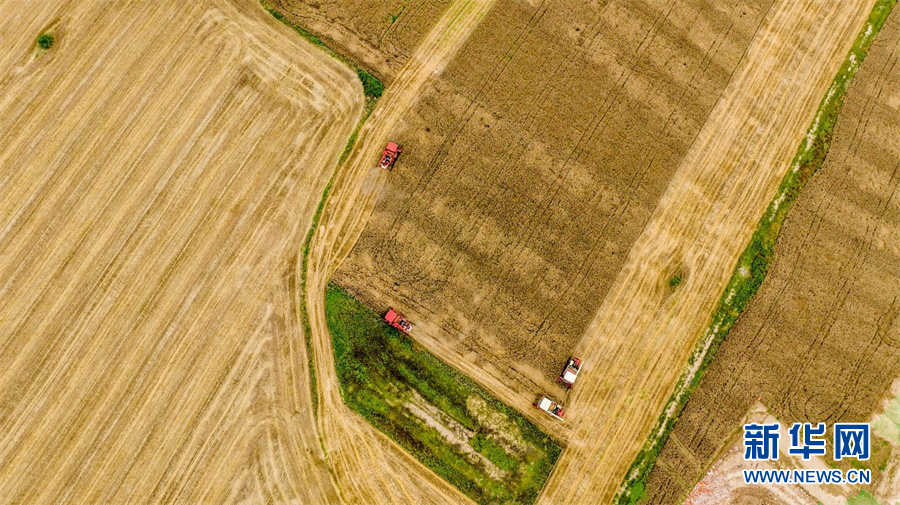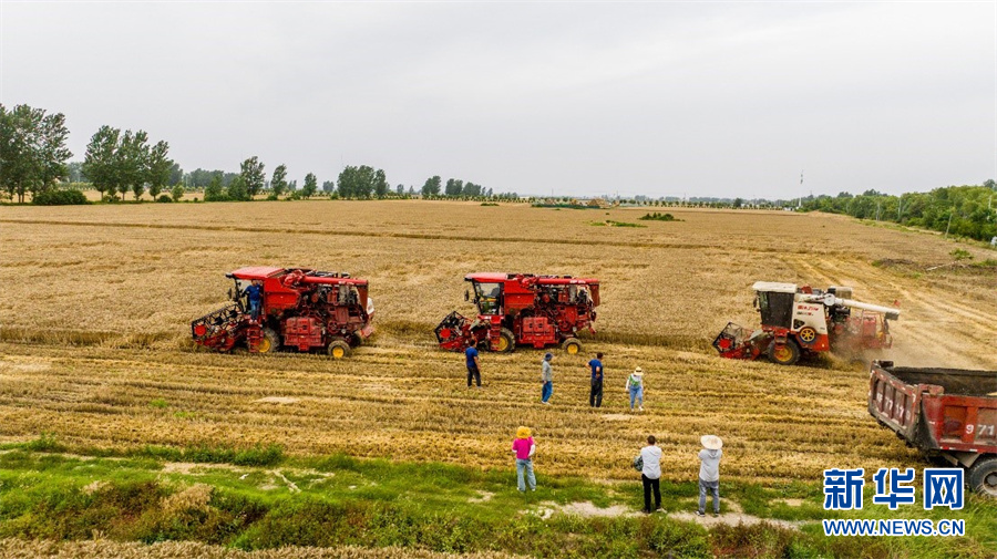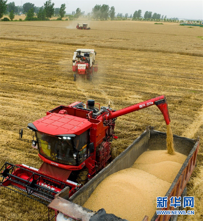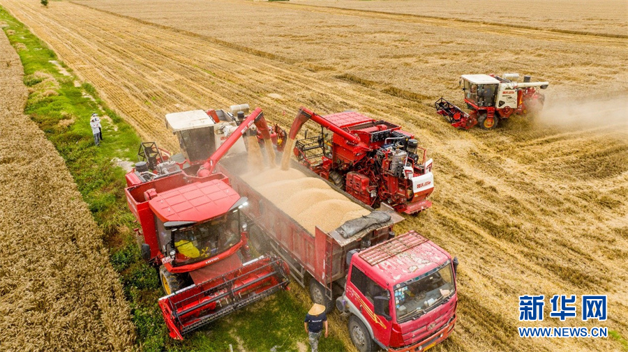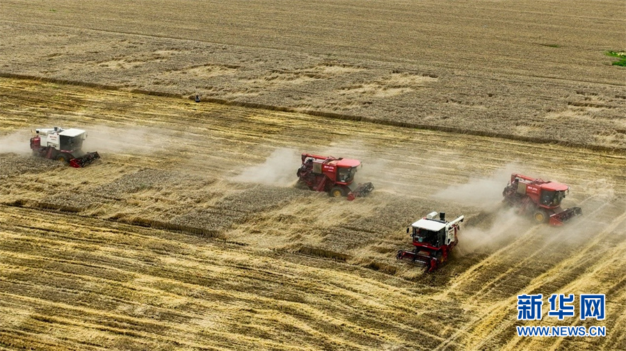 6月7日,在安徽省淮北市濉溪县百善镇道口村,农机手驾驶收割机抢收小麦。正值“三夏”时节,安徽省淮北市濉溪县田间地头一派忙碌景象,农机手驾驶收割机抢收夏粮,确保颗粒归仓。新华网发(鲁剑 李莹 摄)
