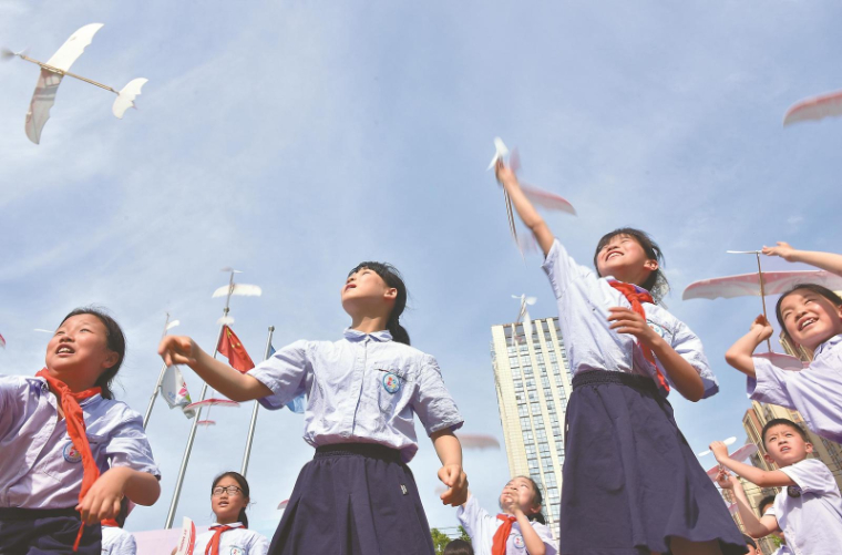 6月8日,在合肥市南岗小学,学生们在放飞飞机模型。当日,该校举办航空科普进校园系列活动,激发孩子们爱科学、学科学、用科学的热情。本报通讯员 葛宜年 摄