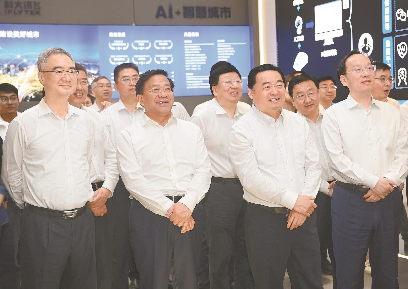 中国科学院合肥物质科学研究院是合肥综合性国家科学中心的核心建设单位,已建成并运行全超导托卡马克、稳态强磁场两个国家大科学装置。下午,代表团来到中科院合肥物质科学研究院,先后参观这两个大科学装置模型和实验控制大厅,郝鹏、李乐成等边看边听取讲解,详细了解实验装置发展进程、领跑技术、沿途下蛋、参与国际合作等情况。韩俊说,要推动两省大科学装置共建共享,支持高校科研院所联合开展关键核心技术攻关,共同助力国家实现高水平科技自立自强。随后,代表团参观考察科大讯飞股份有限公司,现场观看智能语音、讯飞星火认知大模型、羚羊工业互联网应用演示,一致认为人工智能产业发展前景广阔、大有可为,两省要推动人工智能头部企业强强联合,促进人工智能和实体经济深度融合,共同抢占未来通用人工智能产业发展制高点。中安创谷科技园是“资本、政策、技术、人才、创新、产业”融合发展的大科创生态平台。代表团走进中安创谷全球路演中心,察看企业产品展示,听取园区发展建设、合肥招商引资等情况介绍,表示要学习借鉴合肥在产业投资、资本运作等方面的好经验好做法。韩俊说,皖辽创新资源都很丰富,希望两省在科创平台建设、科技成果转移转化、创新型企业孵化培育等方面加强交流,共同开辟发展新领域新赛道,携手塑造发展新动能新优势。