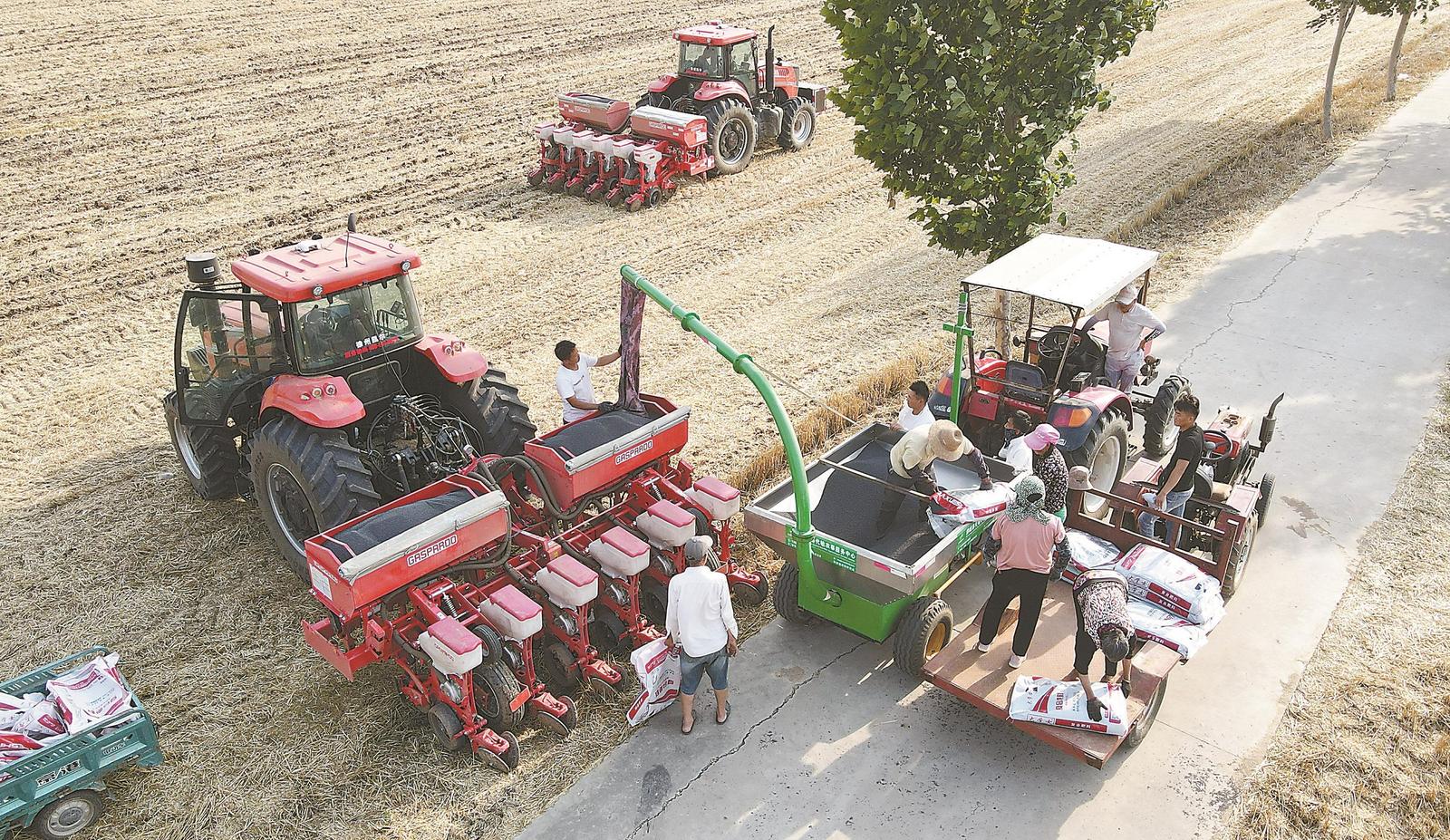中午时分,记者又来到颍州区三塔镇。一处刚收完的麦田里,农户李克印顶着烈日忙碌着,播种机驶过,玉米种子被播撒在田地里,只留下一排排笔直的播种痕迹。“预计5天后就出苗了。夏至前后就可以在玉米行间种大豆,按4行玉米、6行大豆安排。”李克印说。