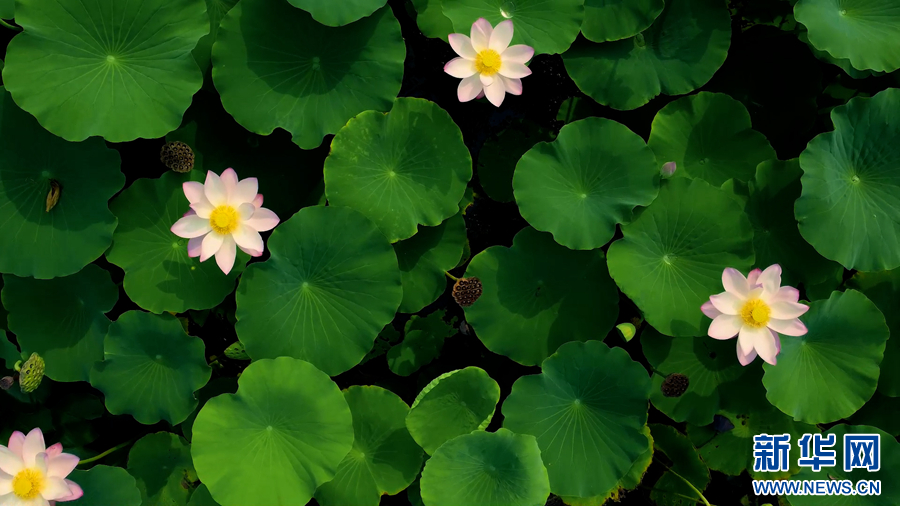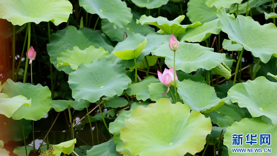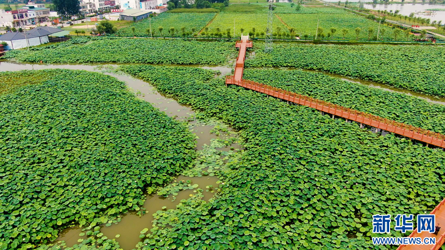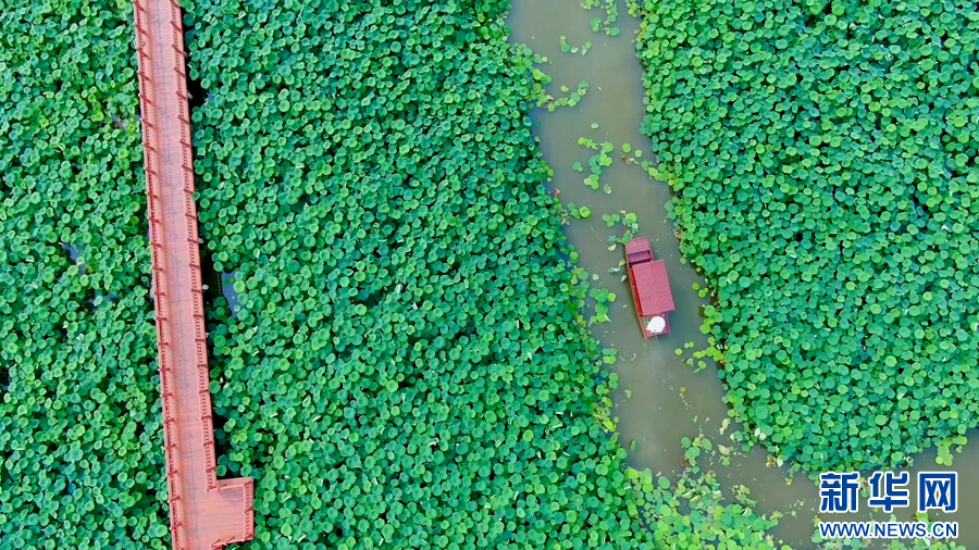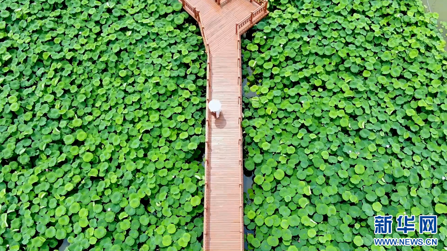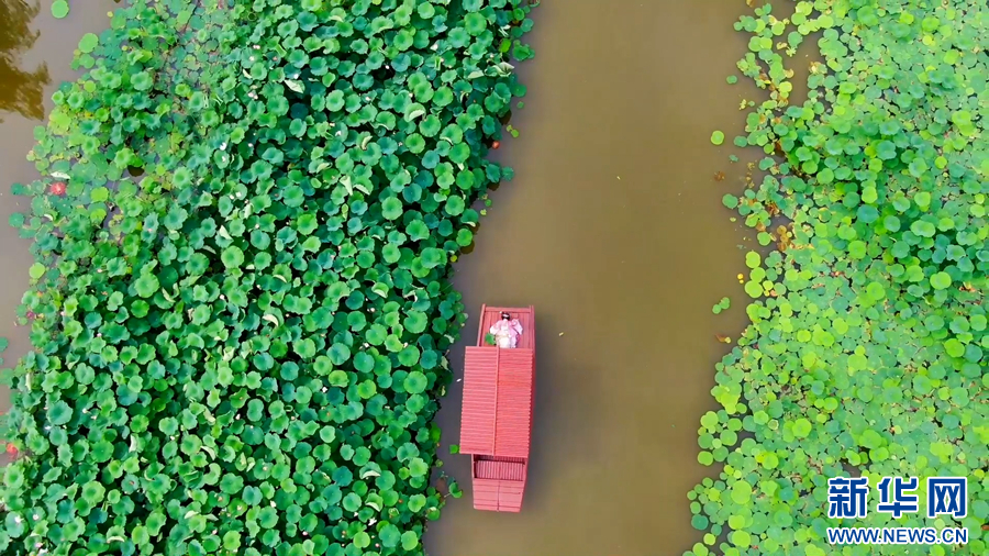 仲夏时节,在安徽省阜南县枫柏岗景区内,千亩荷花竞相开放,美丽淡雅的荷塘景色引得游客纷纷前来打卡拍照。