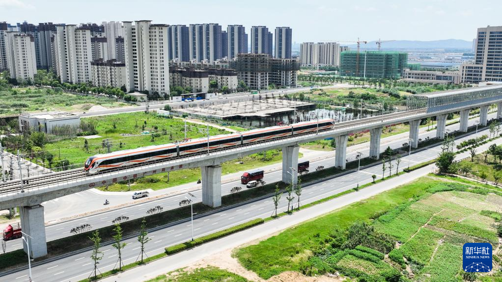这是在滁州市拍摄的滁宁城际铁路列车(6月28日摄,无人机照片)。