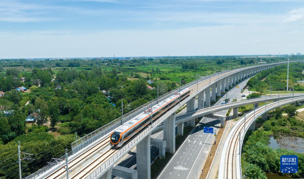 这是在滁州市来安县境内拍摄的滁宁城际铁路列车(6月28日摄,无人机照片)。