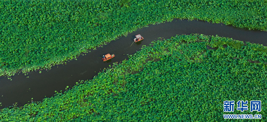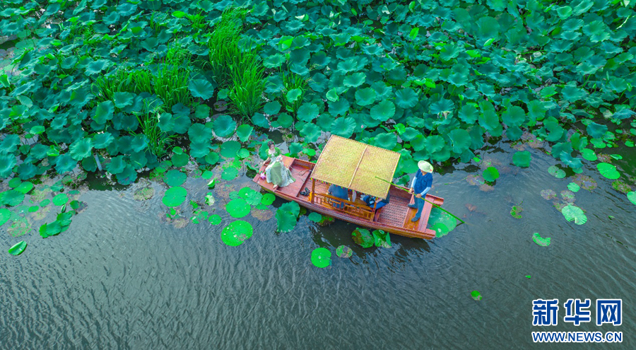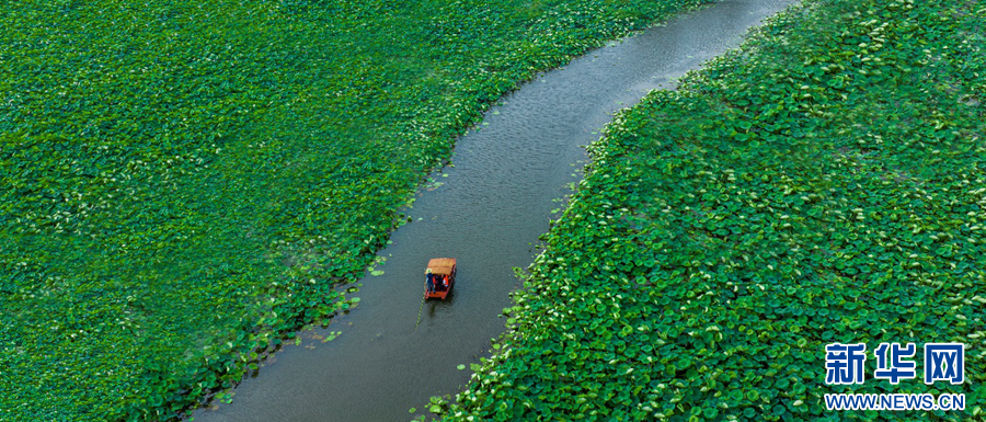 7月6日,一叶扁舟穿梭于荷塘中(无人机照片)。