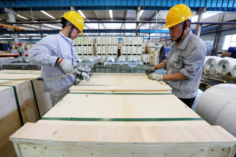 7月8日,在安徽省淮北市濉溪县经济开发区安徽力幕新材料科技有限公司电池铝箔生产车间内,工人们正在赶制出口订单。