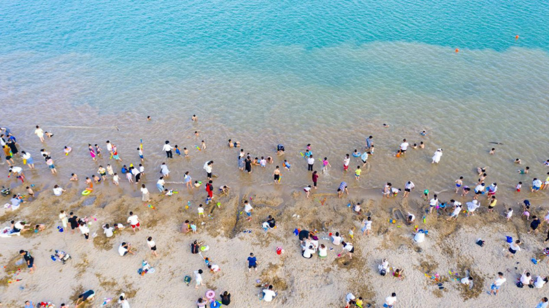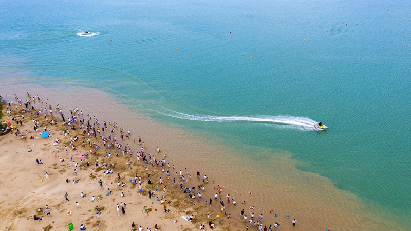 近日,市民在淮北市绿金湖畔人造沙滩上戏水消暑。