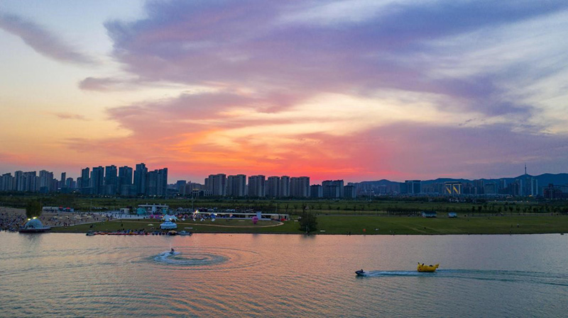近日,晚霞映照下的淮北市绿金湖风景如画。