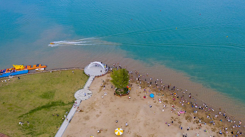 近日,市民在淮北市绿金湖畔人造沙滩上游玩。