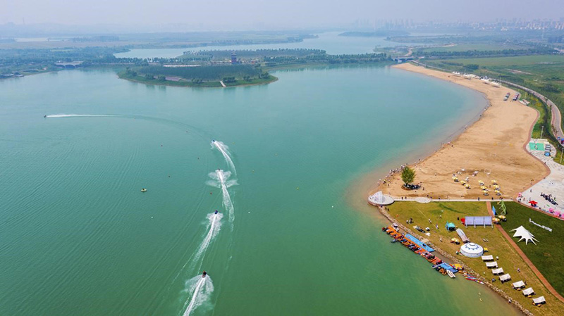 近日,摩托艇在淮北市绿金湖清澈的湖面上行驶,掀起一道道涟漪。