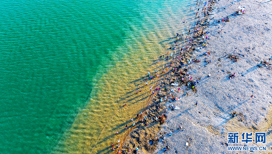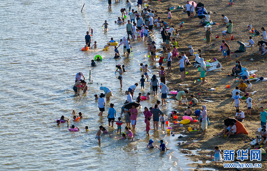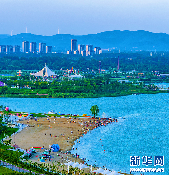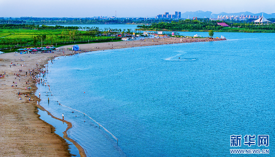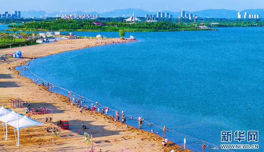 7月14日,市民在安徽省淮北市绿金湖湿地公园的沙滩上戏水消暑、享受清凉。