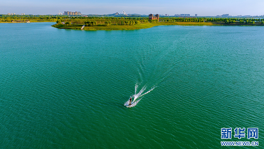 盛夏时节,烈日炎炎,安徽省淮北市的绿金湖湿地公园成了人们避暑纳凉的好去处。近年来,该市多措并举保护湿地水系生态,守护一湖碧水,水系生态颜值日益提升,成为市民休闲、娱乐的打卡地。新华网发(王文 摄)