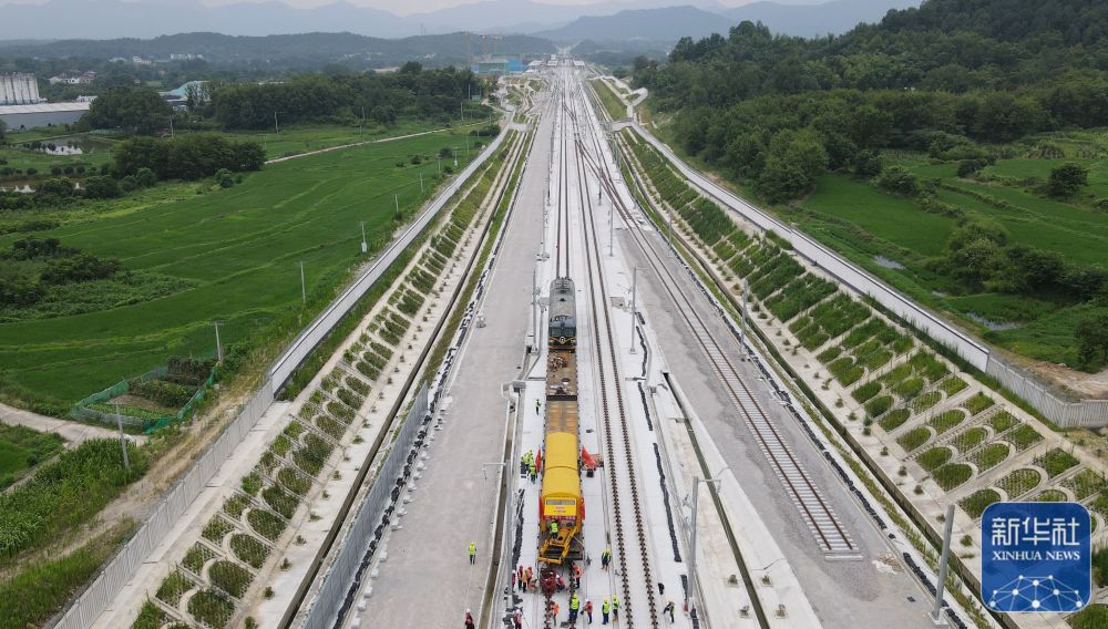 ↑7月15日拍摄的中铁十一局池黄铁路九华山站焊轨施工现场(无人机照片)。
