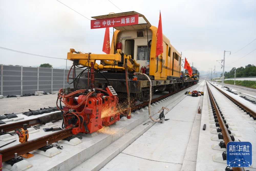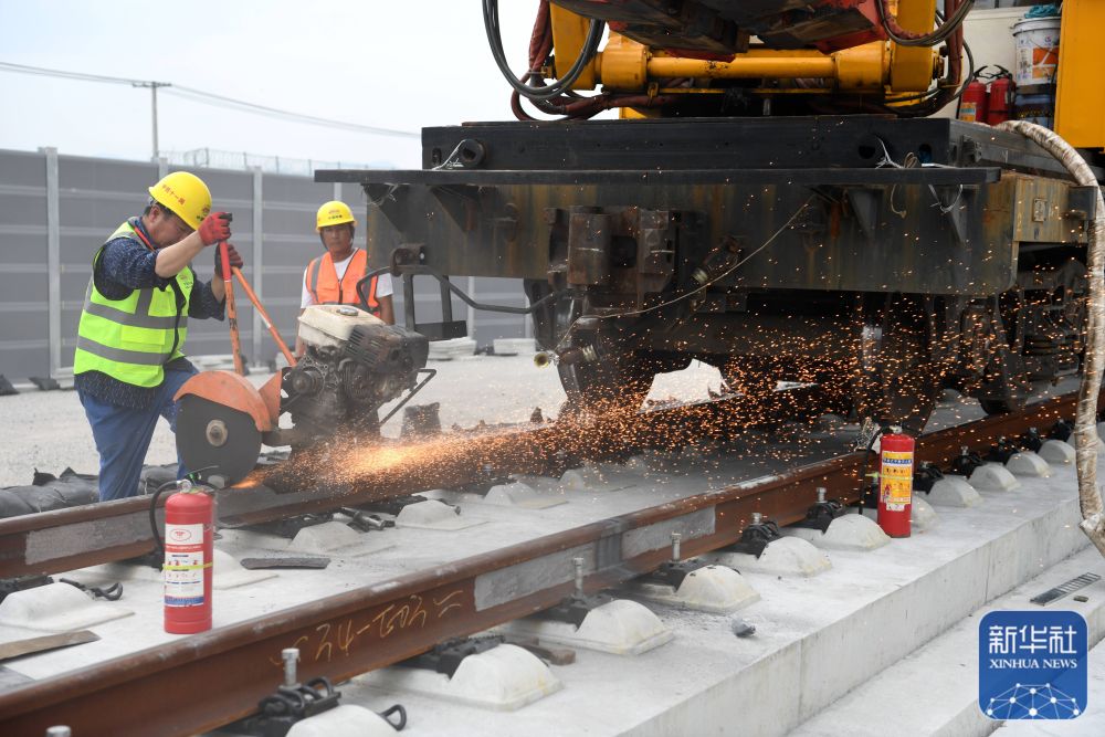 ↑7月15日拍摄的中铁十一局池黄铁路九华山站焊轨施工现场。