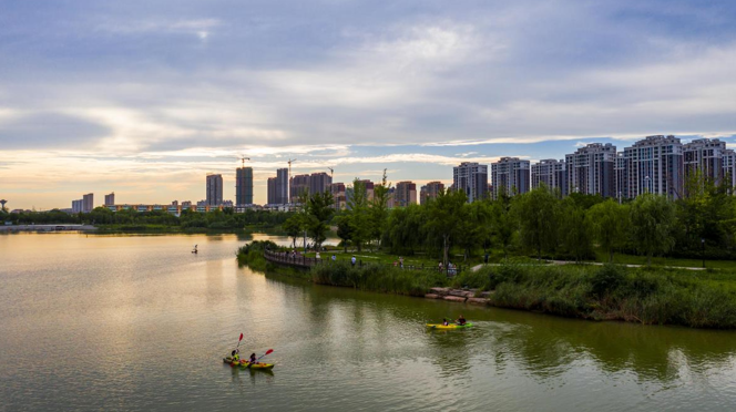 7月15日,市民在安徽省淮北市濉溪县乾隆湖划船游玩。