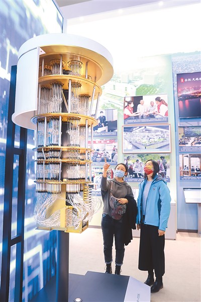 2022年11月4日,参观者在北京举行的“奋进新时代”主题成就展上观看可编程量子计算系统“祖冲之号”模型。