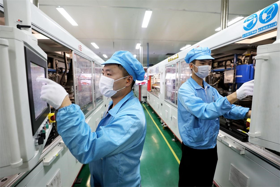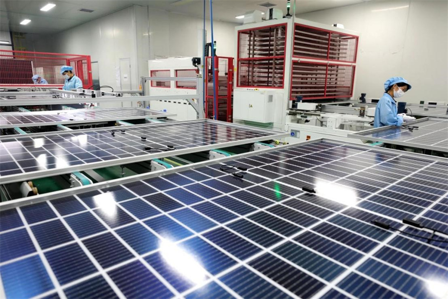 7月22日,安徽省淮北市烈山经济开发区一家新能源企业生产线上,工人们正在赶制用于出口的太阳能光伏组件。