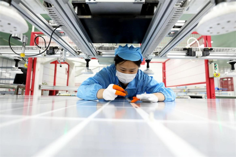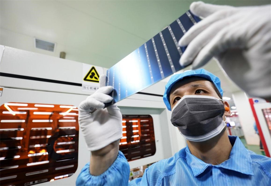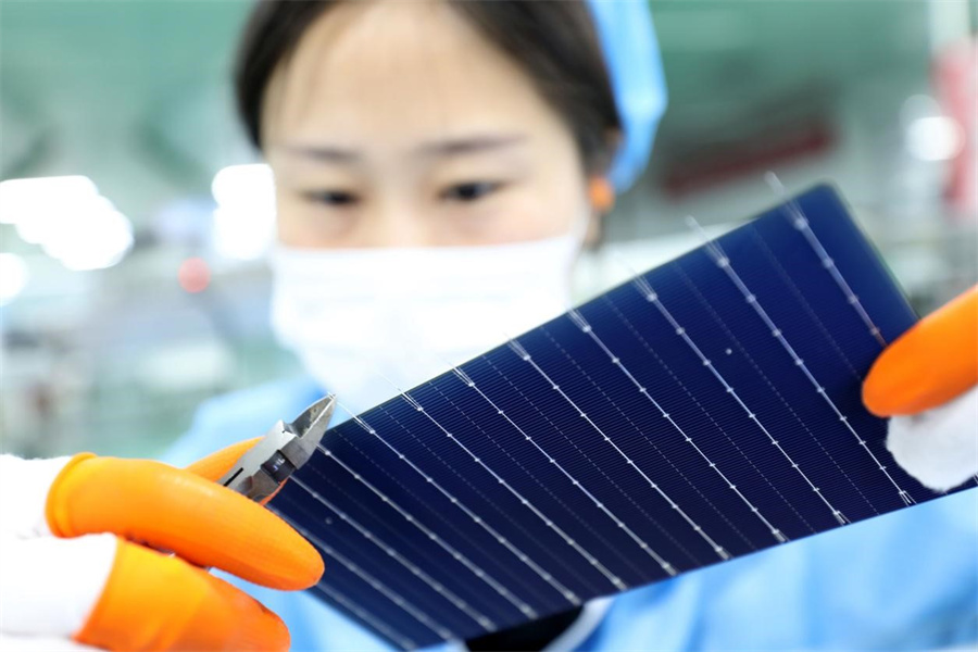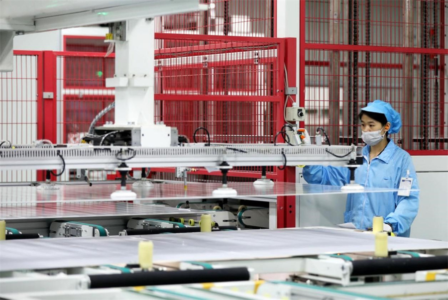 7月22日,安徽省淮北市烈山经济开发区一家新能源企业生产线上,工人正在赶制用于出口的太阳能光伏组件。