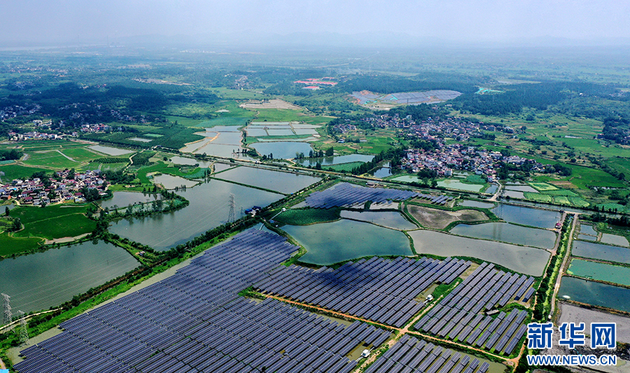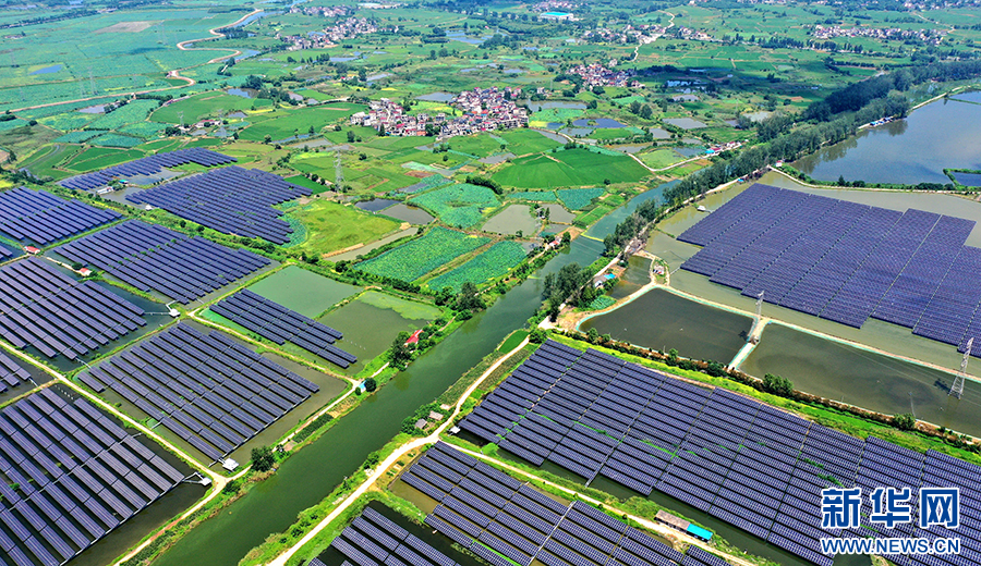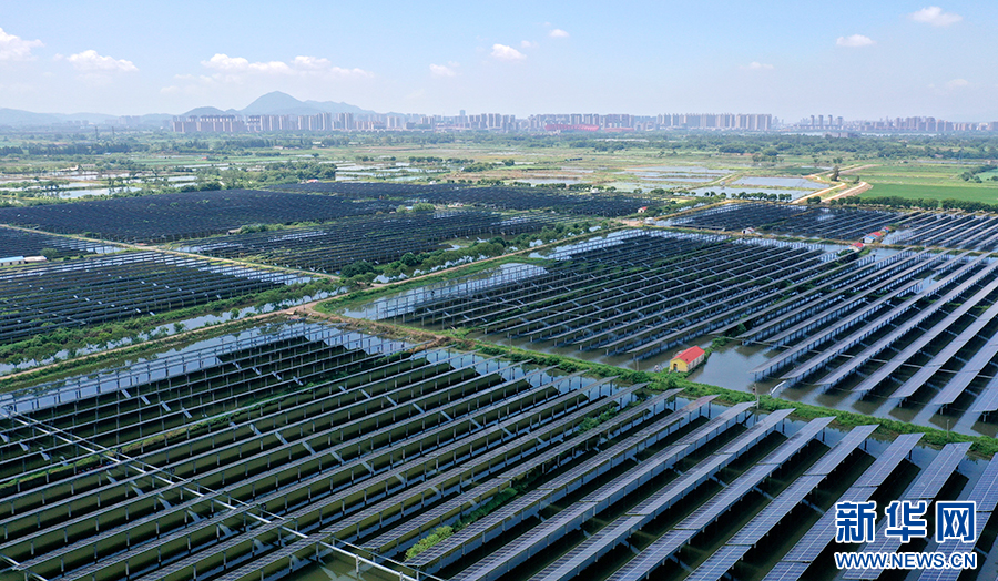 近年来,安徽省铜陵市义安区因地制宜、加快推进“渔光互补”光伏发电项目建设,将光伏发电和渔业养殖相结合,实现板上发电、板下养鱼,渔光互补,为乡村振兴、生态富民增添绿色发展动力。新华网发(过仕宁 摄)