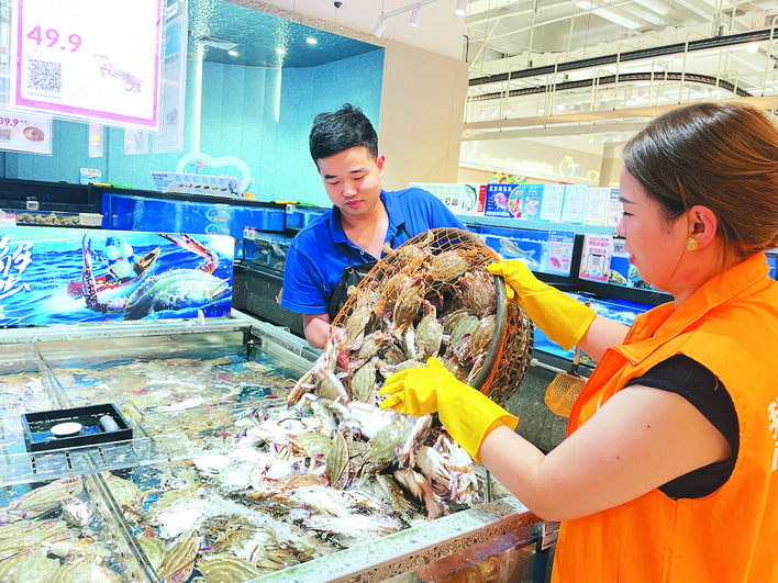 8月8日上午,在长江西路盒马门店海鲜区,巨大的梭子蟹宣传海报提醒着市民,东海梭子蟹到货了。