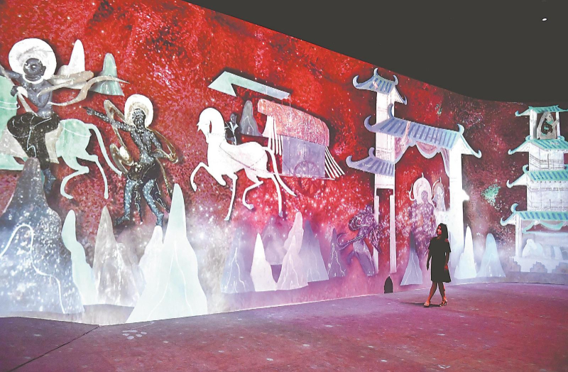由省美术馆联合敦煌研究院推出的全新大型沉浸式展览“敦煌壁影——壁画与数字艺术展”近日在安徽省美术馆开展,现场展示了历代敦煌守护者所临摹的30余幅敦煌壁画作品和沉浸式影片。
