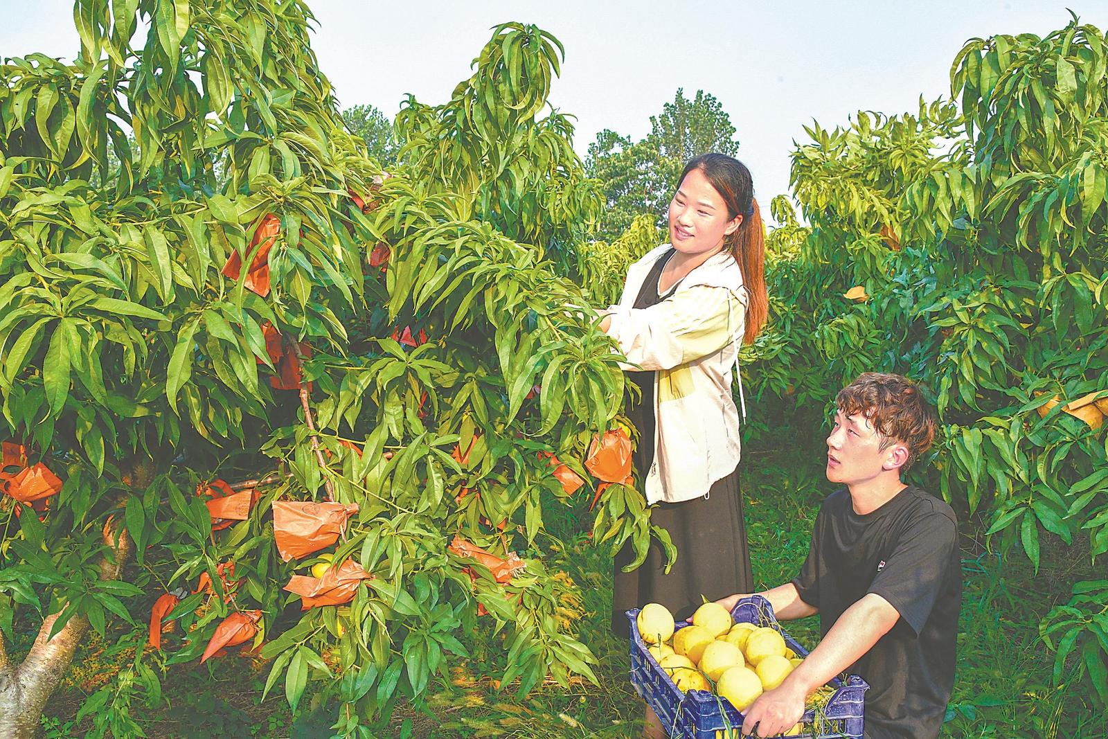 8月10日,游客在亳州市谯城区古井镇黄桃种植基地体验采摘乐趣。亳州市谯城区聚力打造“一村一品”,因地制宜发展黄桃、葡萄、桑葚等特色观光采摘农业,实现村集体经济和村民收入同步增长。 通讯员 张刘艳 摄