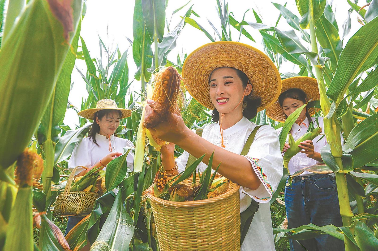 8月8日,马鞍山市博望区新市镇伴山生态文化乐园特色农产品种植基地,游客在采摘玉米。近年来,博望区推动农旅产业深度融合发展,促进农业增效、农民增收。 特约摄影 王文生 摄