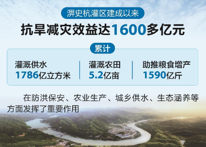 一渠清水润两省,“人间天河”淠史杭。今年8月19日是淠史杭工程开工建设65周年纪念日。8月14日,记者从省政府新闻办在六安市举办的新闻发布会获悉,淠史杭灌区建成以来,抗旱减灾效益达1600多亿元,累计灌溉供水1786亿立方米、灌溉农田5.2亿亩、助推粮食增产1590亿斤,在防洪保安、农业生产、城乡供水、生态涵养等方面发挥了重要作用。