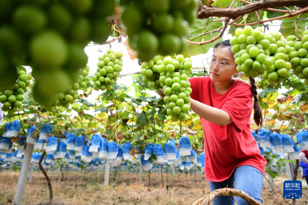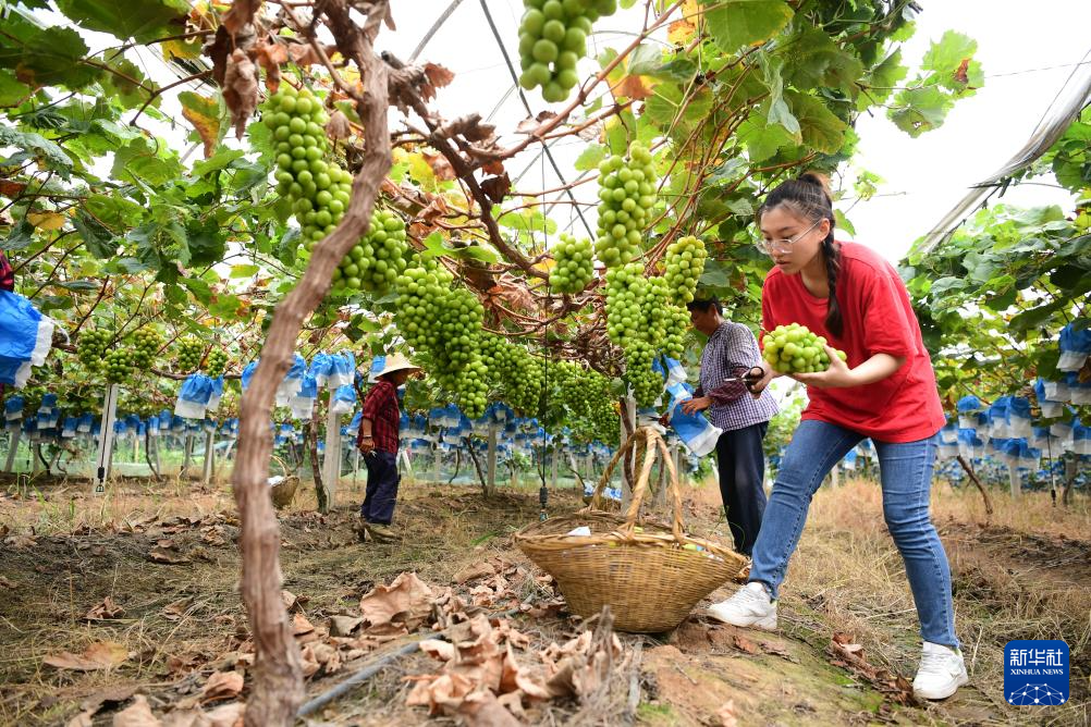 8月30日,潘雅洁(右一)在肥西县紫蓬镇的葡萄园里采摘葡萄。新华社记者 刘军喜 摄