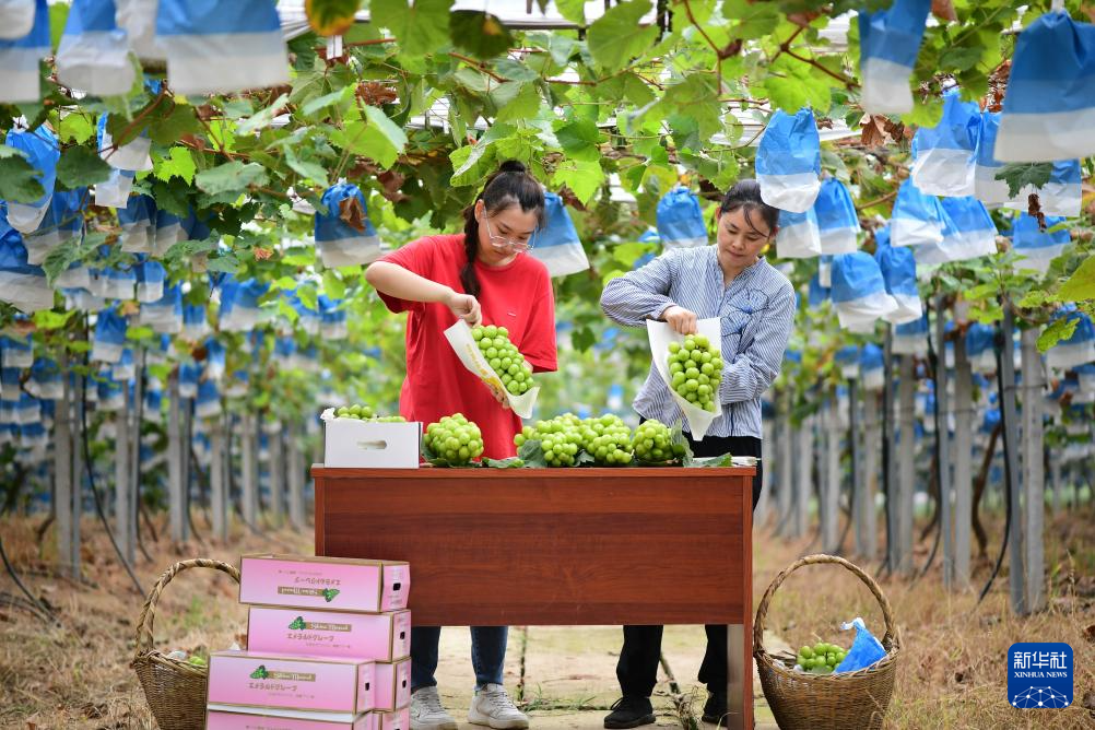 8月30日,潘雅洁(左)在肥西县紫蓬镇的葡萄园里包装刚采摘的葡萄。新华社记者 刘军喜 摄