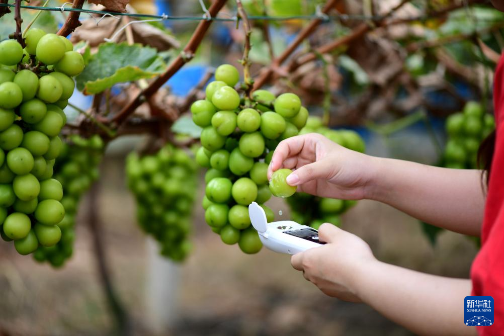 8月30日,潘雅洁在肥西县紫蓬镇的葡萄园里用仪器检测葡萄的含糖数据。新华社记者 刘军喜 摄