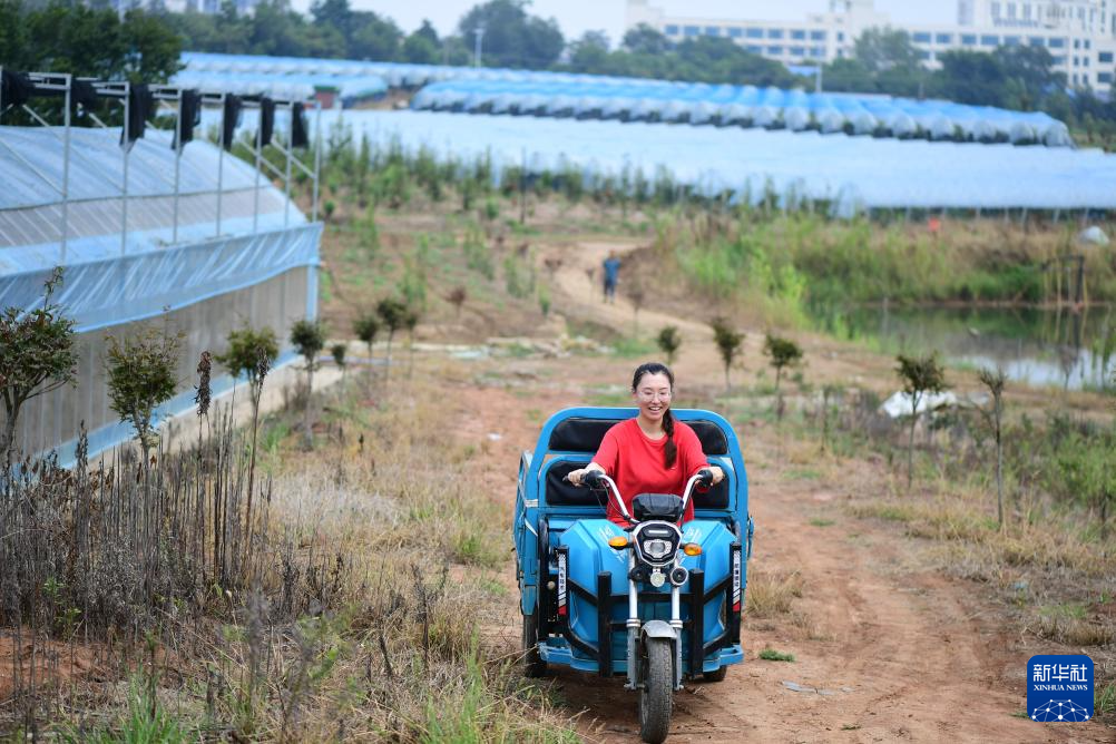 8月30日,潘雅洁在肥西县紫蓬镇的乡村田园综合体内驾驶农用车运送农资。新华社记者 刘军喜 摄