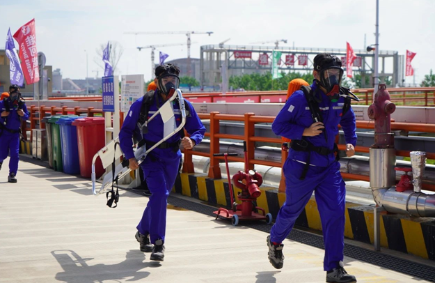 当天上午10时,演练拉开序幕。此次演练为液化天然气(LNG)燃料动力船舶加注作业安全事故应急救援演练,模拟场景为受突发强对流天气影响,芜湖长江LNG加注站在船舶LNG加注过程中,突发大量LNG泄漏,现场1名操作人员被LNG冻伤,泄漏的LNG气化后遇加注船非防爆电气设备起火燃烧,船上人员在紧急撤离过程中3人不慎落水……演练采用实战演练方式,共设置了事故发生与信息报告、响应启动与先期处置、联动处置、响应终止与后期处置等4个科目,演练全过程有条不紊,各单位参演人员各司其职,人员之间密切配合,反应迅速,过程连贯,达到了演练预期的效果,圆满完成此次应急演练。