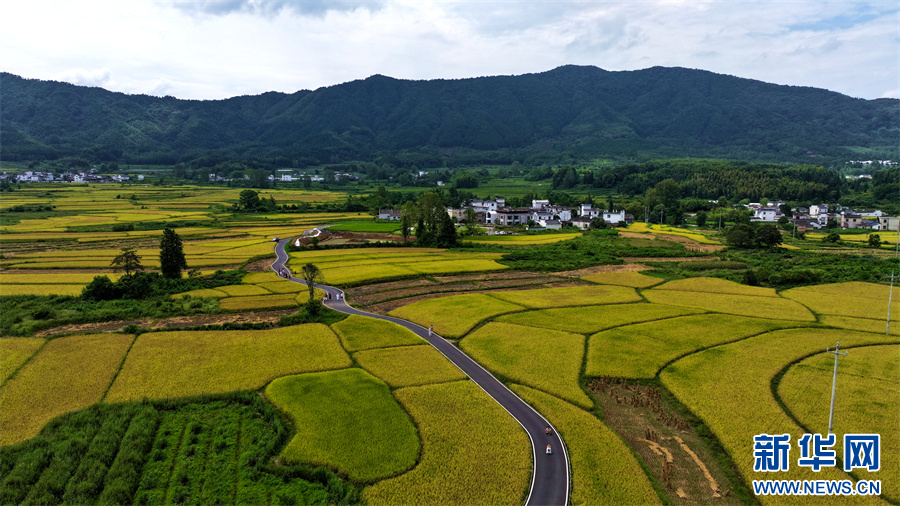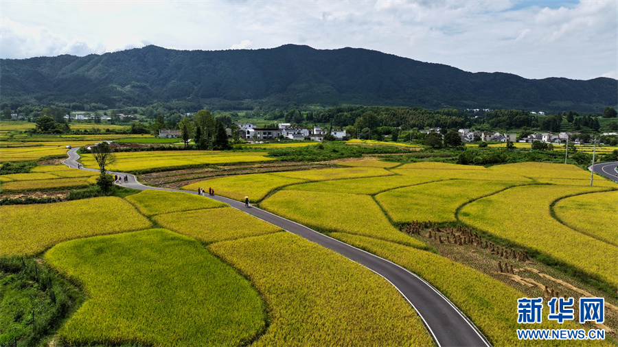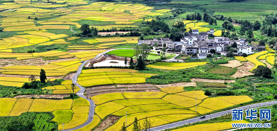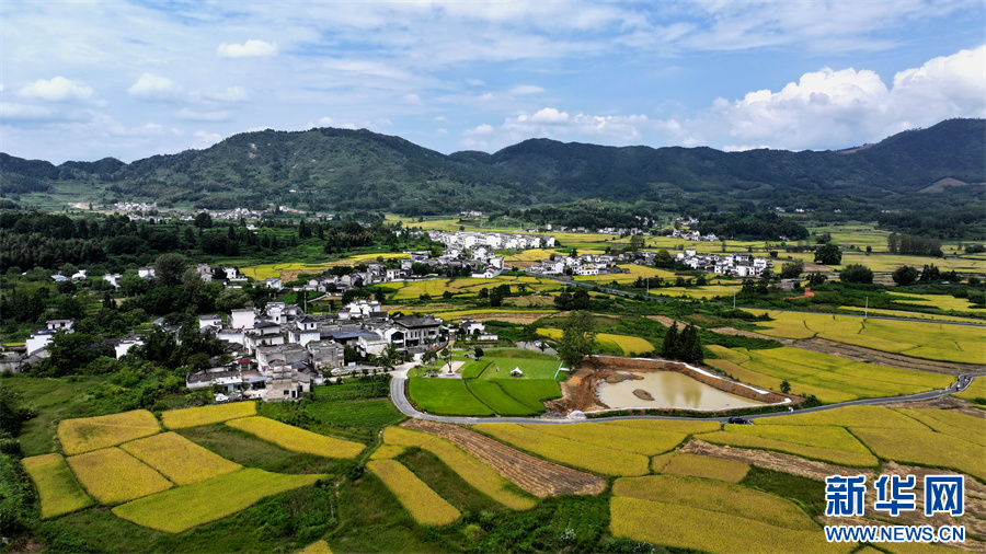 9月6日,在安徽省黄山市黟县碧阳镇关麓村,大片青黄色的稻田与连绵的青山、错落的徽派民居相映成趣,宛如一幅秋日田园画卷。新华网发(潘成 摄)