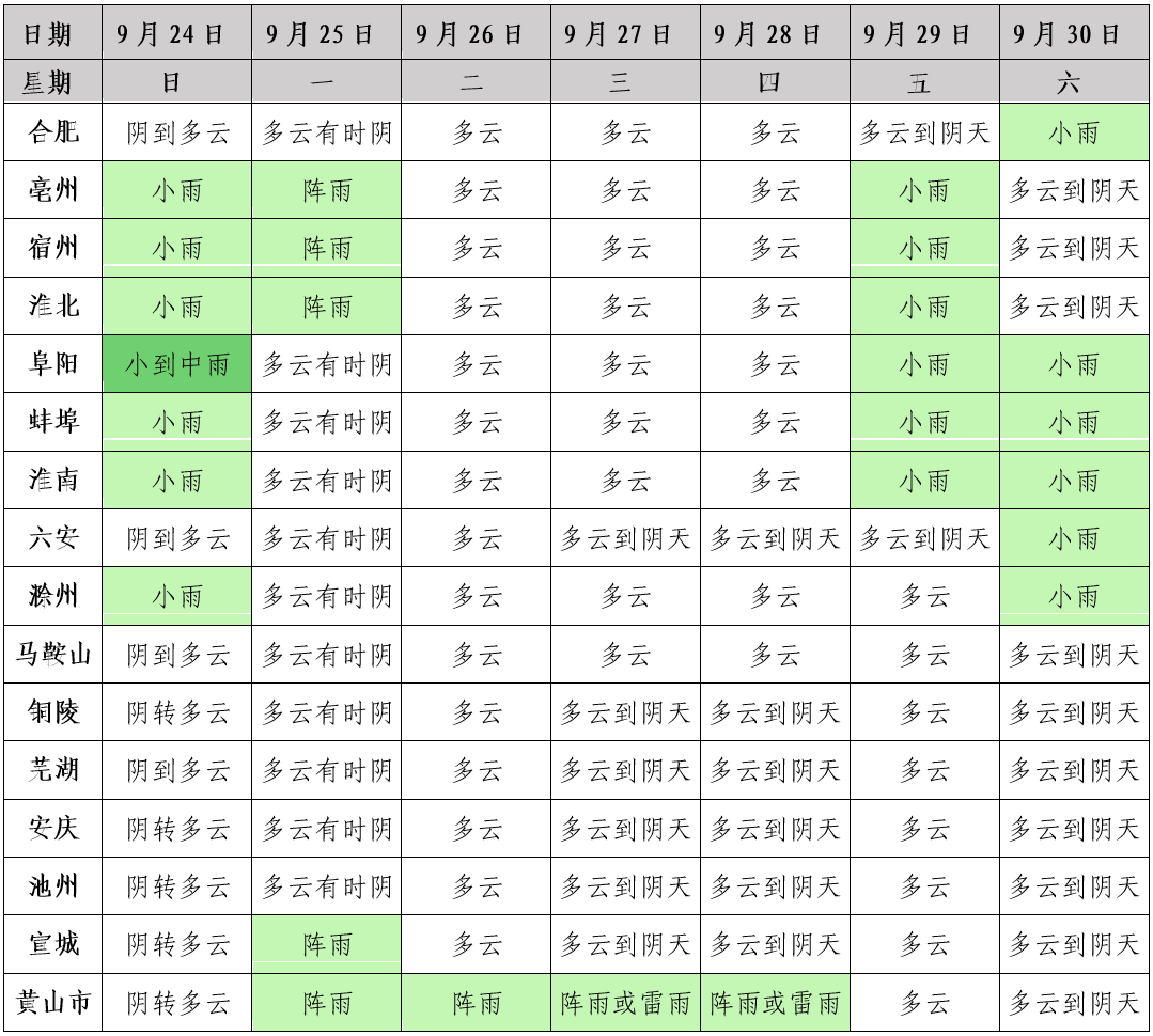 25日:全省多云有时阴天,其中淮北地区北部、大别山区和江南部分地区有阵雨。