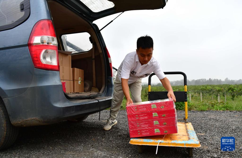 9月26日,段鹏飞在种植园里将包装好的猕猴桃装车。