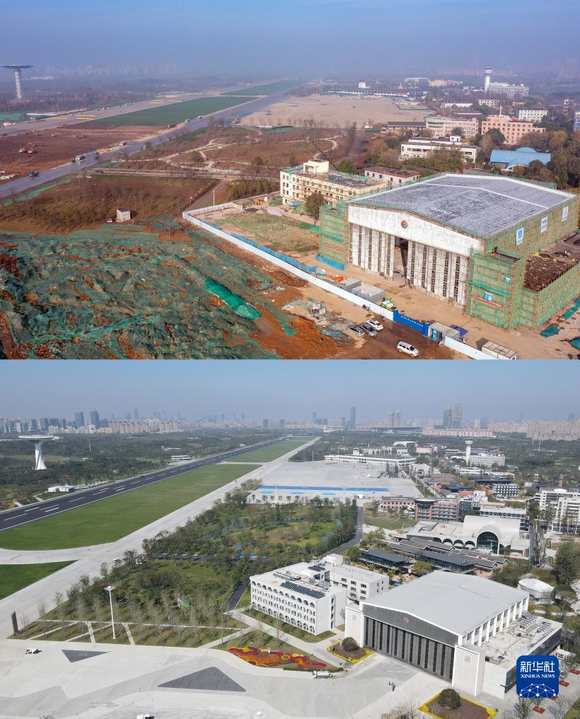 这是一张拼版照片:上图为2022年11月25日拍摄的已停用的合肥骆岗机场,右下角为曾经的机库(无人机照片,新华社发 黄洋洋摄);下图为2023年10月17日拍摄的合肥骆岗公园,机库已改造为艺术厅(无人机照片,新华社记者周牧摄)。